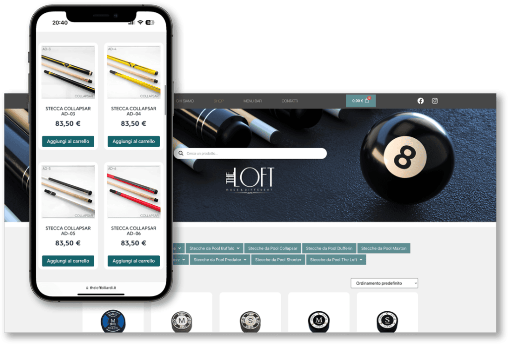 Siamo entusiasti di annunciare che la nostra offerta non si limita più solo al negozio fisico situato all’interno del The Loft, ma si estende anche al mondo digitale. Grazie al nostro nuovo sito web, hai l’opportunità di esplorare e conoscere la nostra vasta gamma di articoli e accessori per il biliardo in modo semplice e veloce. Navigando attraverso il nostro menu, potrai scoprire tutto ciò che offriamo, dalle stecche da biliardo di marche prestigiose ad articoli di nostra produzione. La sezione shop del sito è stata progettata per offrirti un’esperienza di acquisto intuitiva e coinvolgente; qui potrai visualizzare i nostri articoli più apprezzati e trovare ispirazione per il tuo prossimo acquisto.
